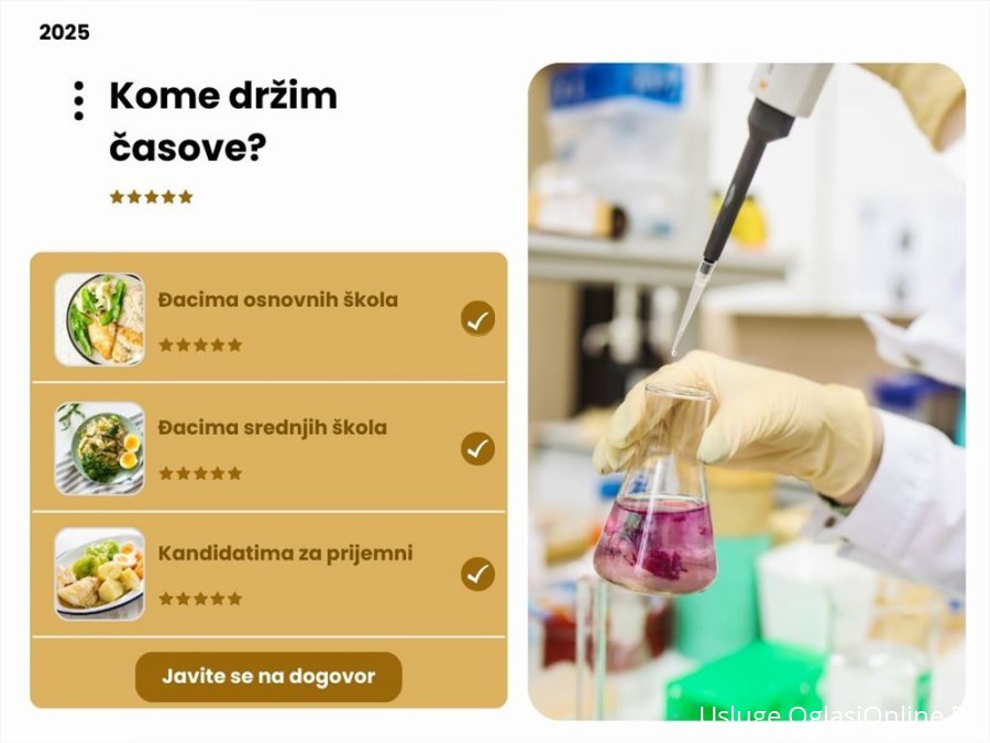 Časove drži dr Ivana Borišev, farmaceut i doktor hemijskih nauka, sa decenijskim iskustvom u radu sa učenicima i studentima, kako kroz privatne časove, tako i u nastavničkom radu na fakultetu.
